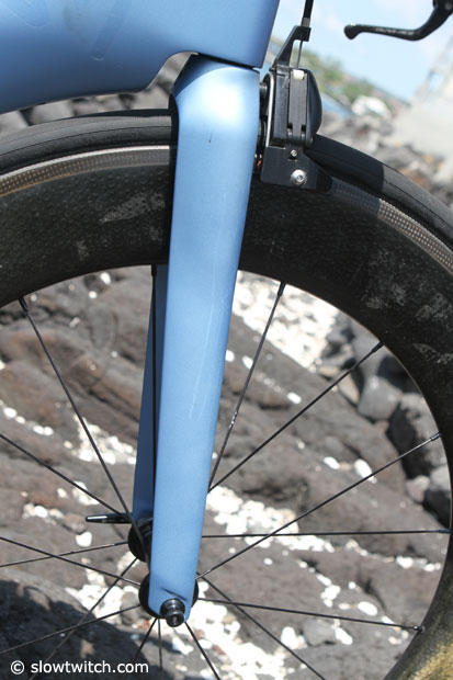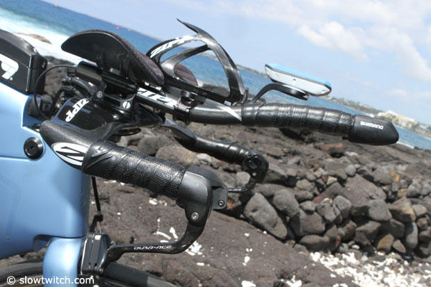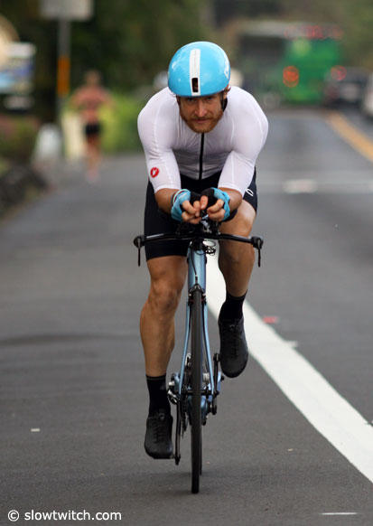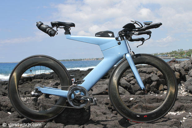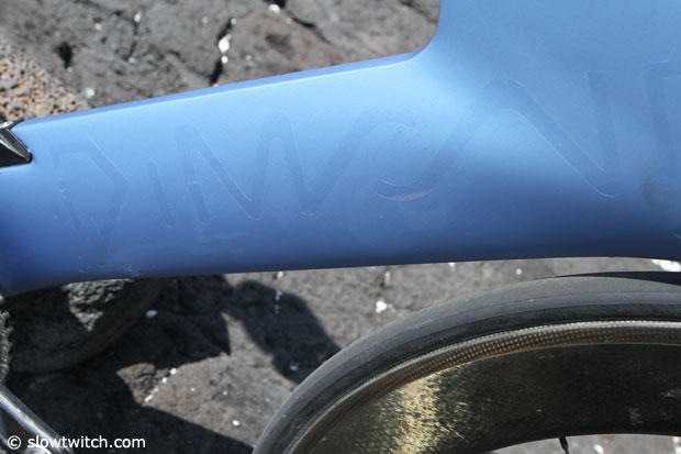 Syracuse, NY resident Eric Hinman raced M30-34 in Kona and had a 9:38:59 finish. A few days before the race we checked out the custom blue Dimond race bike of this fast 5'10" tall 165 pound crossfit training athlete.