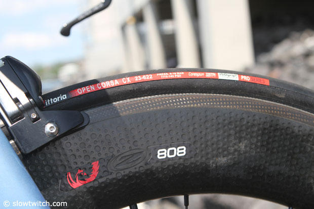 Hinman did not race with the Vittoria tires he had on here, he rode Continental GP 4000S ones.