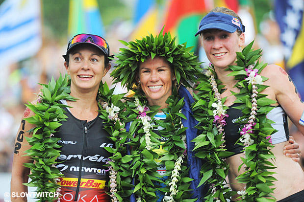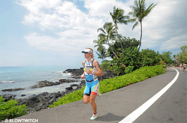 ST: As a group, they were all off their best form. Joyce ran 3:06:27 – 3 minutes slower than 2013. Ryf never ran Kona but might have been expected to run 5 minute faster than her 3:07:00. Swallow ran 3:08:45 and has a sub-3 hours Ironman marathon in her past. Steffen ran 3:08:43 – 3 minutes faster than her 2013 run but 3 minutes off her 2010 Kona best. As a group they were only able to muster one 3:05 and the rest 3:07 and 3:08 runs. If any of them had been able to run anywhere near their best, you might have had to settle for silver or bronze., Why do you suppose they gave up so much time on the run while you repeated your record-setting pace?