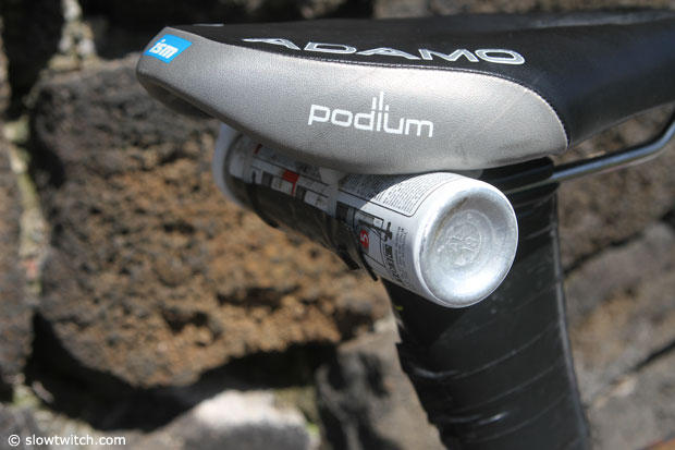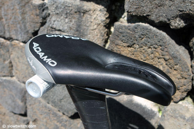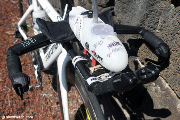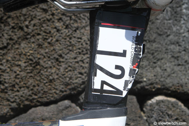 In case you wondered about the electric taping job on the seat post, it is not to cover a strange sponsor, but to hold on the race number.