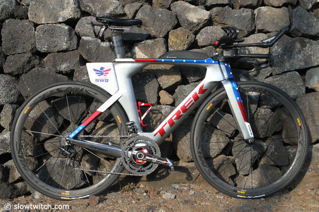 Besides making just very good components there are two strategic reasons Shimano has gained over its rival SRAM. One has to do with how Trek bikes are sold to triathletes and, remember, Trek had an "incremental" gain of 95 bikes year-over-year based on my calculation. Trek's Project One program is exceedingly popular, and if you've been looking at the right hand column of the Slowtwitch home page you've seen a steady stream of Speed Concepts profiled, owned by pro and age group racers, and they each have distinctive paint schemes. That's part of the beauty of that P-1 process: custom paint. But it's also custom component options. Stores that might have been reticent to floor, in advance, size runs of very expensive, risky, pricey Speed Concepts outfitted with electronic groupkits have sold these bikes without risk due to the pay-as-you-go P-1 sales process. Trek has made it very easy to spec and buy the electronic bike you want. One example is Tim O'Donnell's Campagnolo equipped, custom painted SC pictured below.