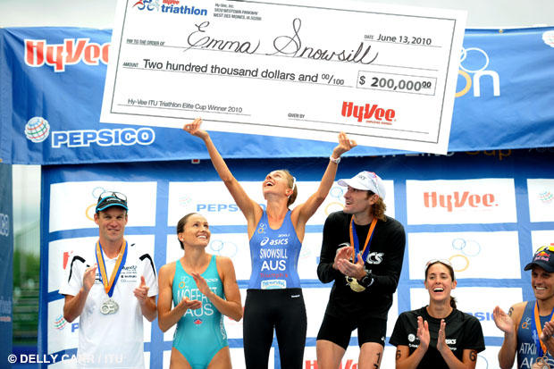At her best, Emma Snowsill was the greatest Olympic distance women's triathlete of all time. She has a women’s best-ever three International Triathlon Union world championship titles (2003, 2005, and 2006) – plus a single day ITU Grand Final win (2010) in the new era which awards the world championship for performance over an entire season. She won the gold medal at the 2006 Commonwealth Games and the 2008 Olympic Games Triathlon in Beijing. She won the big money triathlons four times — two at Life Time Fitness (2005 and 2006) and two at Hy-Vee (2008 and 2010).