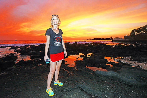 A Tribike Transport aficionado enjoys a brilliant Kona sunset.