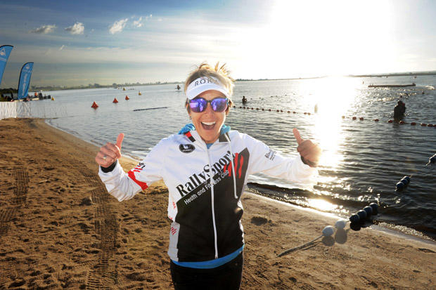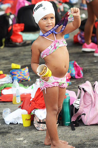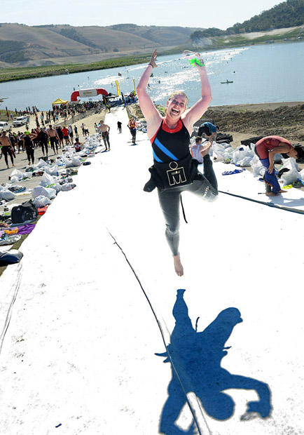 Just practicing her finish line leap after the Wildflower Olympic swim.