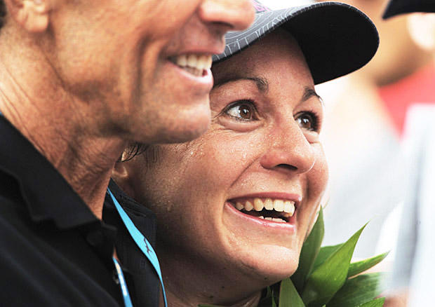 Rachel Joyce has a transcendent smile standing with coach Dave Scott after her 3rd place finish at Kona.