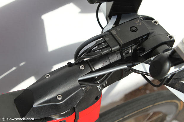 The Shimano Junction A box sits atop the stem and with the steep pitch it is actually out of sight for the wind.
