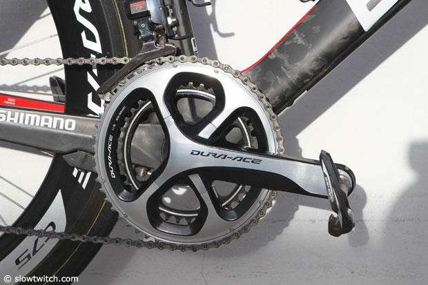 Schildknecht races on 172.5mm cranks with 53-39 chain rings and Shimano Dura-Ace pedals.