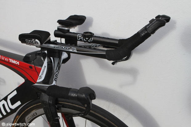 The 6 foot 1 inch tall Ronnie Schildknecht races on a medium long BMC TM01 frame.