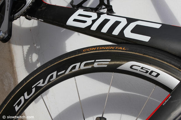 Most of the Uplace-BMC Triathlon team members race on C50 wheels up front. The tire here is a 25mm Continental Competition Pro Ltd.
