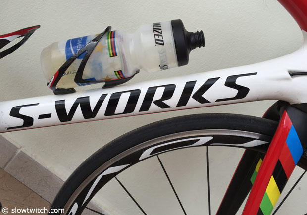 There was still a little electrolyte drink mix left in his Specialized Purist bottle.