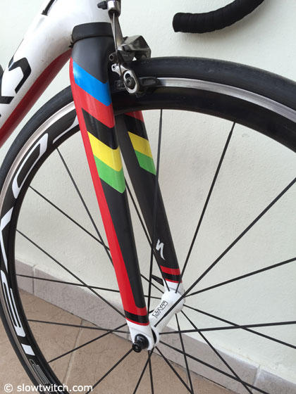 The World Championship themed Specialized S-Works Tarmac sits here just as he rode it here last here in Fuerteventura. But when he raced it in Edmonton, it had no rainbow stripes.
