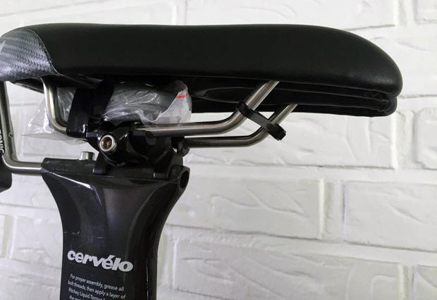 The spare tube is held in place under the saddle with tape, and a ziptie at the front of the rails allows Jensen to get the desired narrowness.