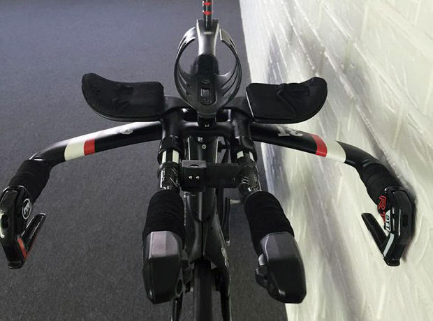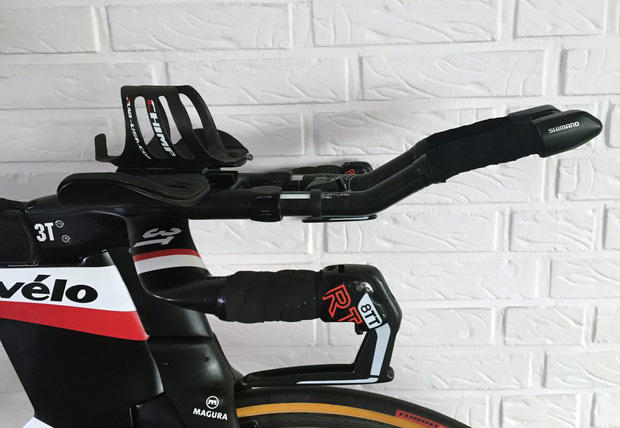 Jensen swapped out the stock 3T Aduro ski bend extensions for the European preferred S bends. An XLab Chimp cage holds the bottle between the arms.