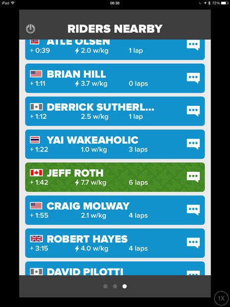 Zwift is also beta testing an iOS or Android app. These are not meant to replace the desktop platform but act as a cycling computer with game features during your ride due to the graphics and processing required by Zwift. The app consists of three screens which are a basic dashboard, an action screen, and a list of nearby riders with direct messaging.