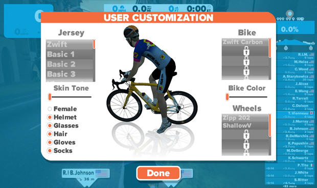 After you pair your devices, it is time to personalize. This is where the gaming platform begins. Users can customize their physical appearance, bike, wheel set, and jersey. As you go further in the game—I mean your training—you can earn merit points for certain achievements that unlock special features. Next you start your ride.