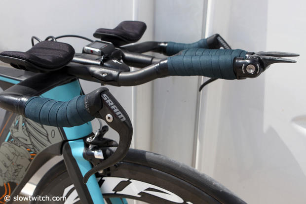 The Specialized Shiv cockpit is completed with SRAM components and bar tape that shows hard hours on this machine.