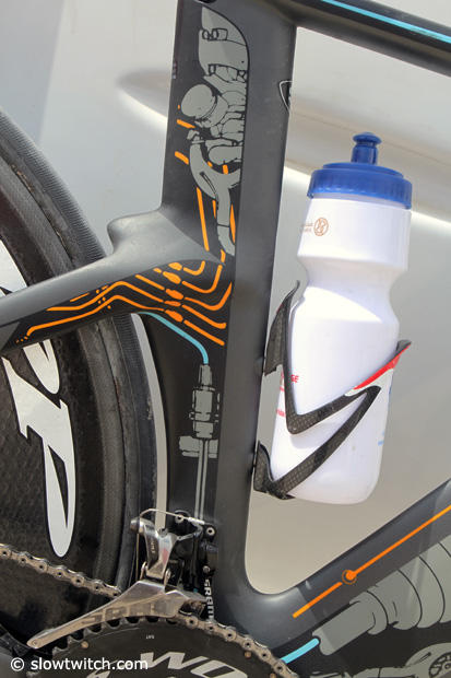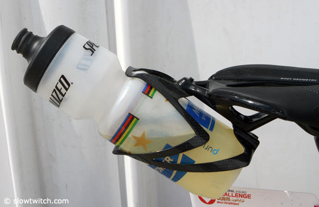 The cage mount under the saddle is pat of the Specialized Sitero offering and here holds a custom Javier Gomez Purist bottle.