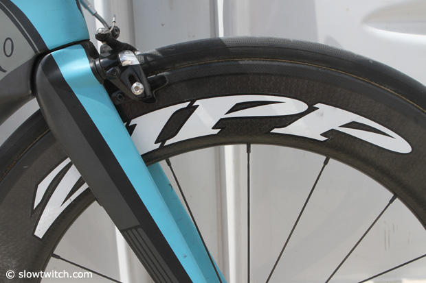 Gomez rides a Zipp 808 up front and a Zipp Disc in the back with 24mm Specialized Turbo tires.