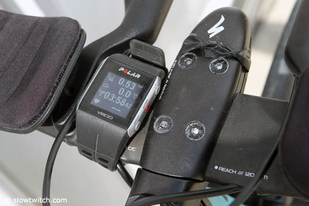 A Polar V800 gave Javier Gomez data during the 56 mile bike segment and the tape on the stem is likely left over from a gel or two.