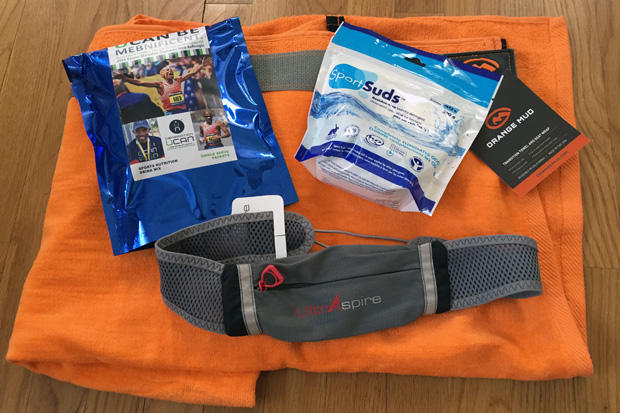 Here is the content of the GearGeekBox we had in our hand and it easily added up to a $100 value, plus discount offers were included too. The favorite part for me was the Orange Mud wrap – seat cover. I will now be able to change next to my car without odd gymnastics, or when in a rush cover my seat and put my sweaty rear on it. The SportsSuds then can help me get it all clean. Also in that box was Ucan nutrition and an Ultra-Spire waist pack.