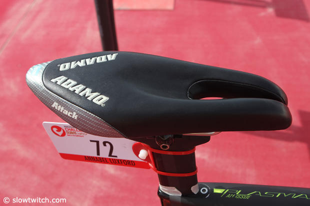 The race bike of Annabel Luxford sits in the bib #72 slot ready for action but where is the fluid nutrition storage we usually see on these bikes? It turns out the very small sized bike combined with a flat stem leaves not enough space.
