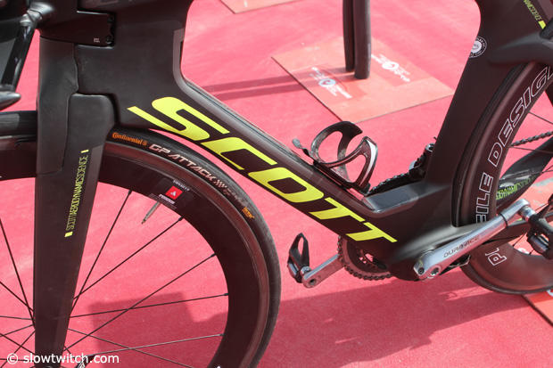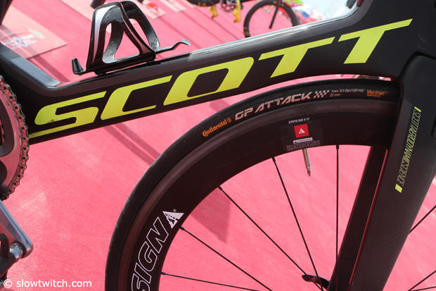 Up front Luxford rides a 22mm Continental GP Attack on a Profile Design 58 Twenty Four wheel.