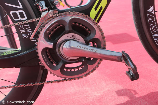 The bike is mostly equipped with SRAM Red components, but Luxford rides a 167.5mm Shimano DA crank with an SRM powermeter.