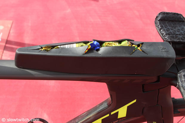 The bento storage unit though was still in place on the top tube and was filled with Powerbar gels.