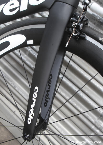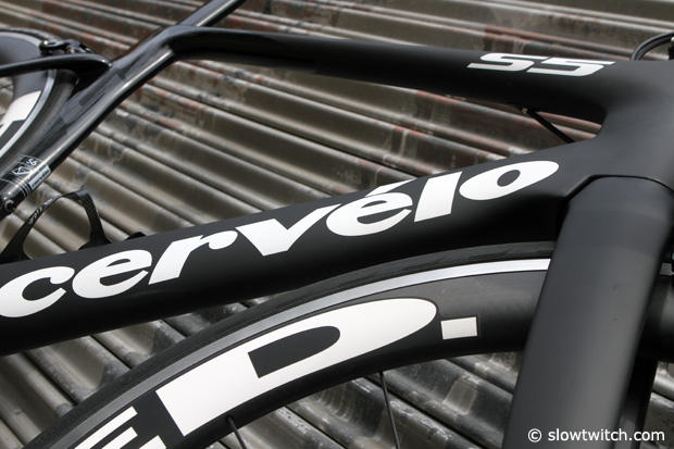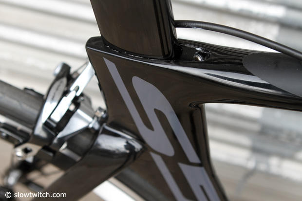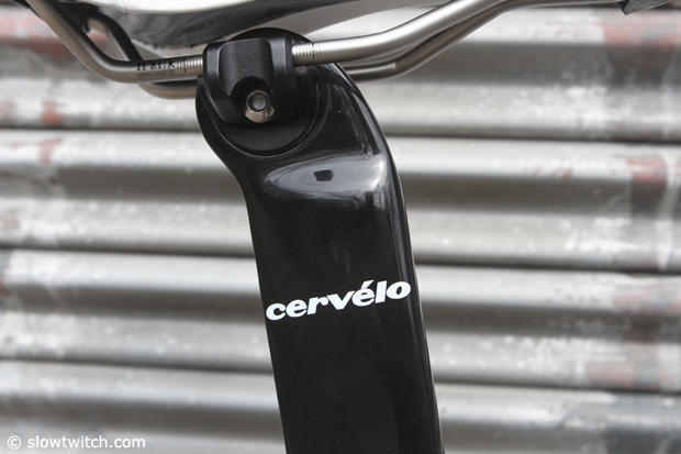 Up close with the seat cluster of the Cervelo S5. The wedge bolt system holds the post well.