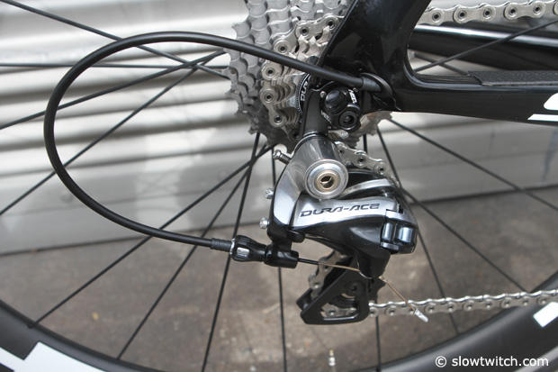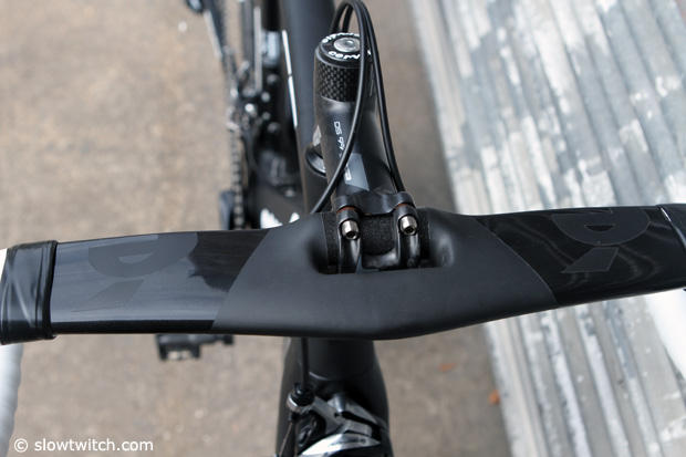 The Shimano Dura-Ace mechanical controls are mounted to the Cervelo aero road bar.