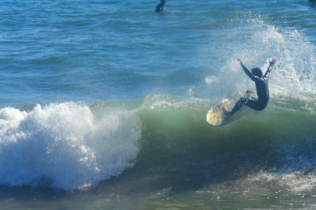 Surfer executes a neat snap turn on a wave crashing near the Oceanside Pier.