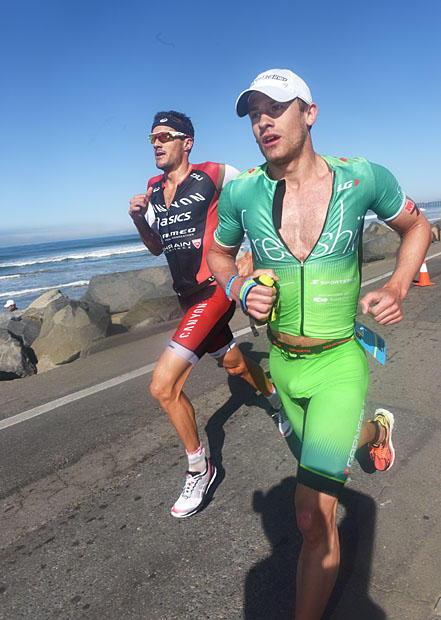 Lionel Sanders and Jan Frodeno duel in the early miles of the run.