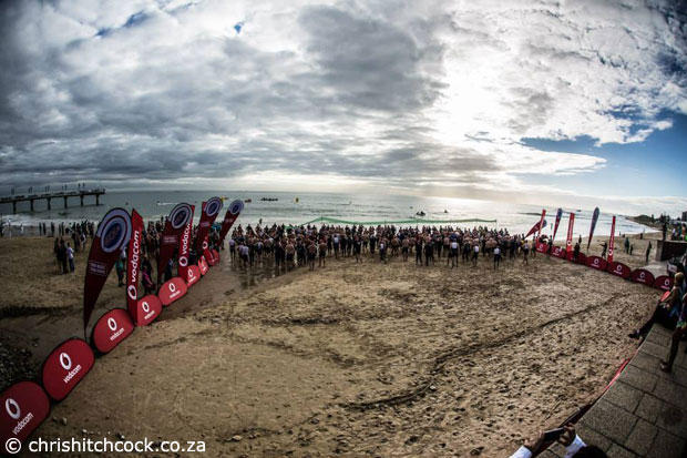19 degree water temps in the Nelson Mandela Bay made it a wetsuit legal affair for all athletes and with the sun coming up and giving the venue a stunning background the pro men charged into the water. Sylvain Sudrie had a great swim and managed to come first out of the water in 49:04 and Mike Aigroz was next a few seconds later. The front group was close together and included local favorite Kyle Buckingham, Ivan Rana, Eneko Llanos, TJ Tollakson and Frederik Van Lierde.