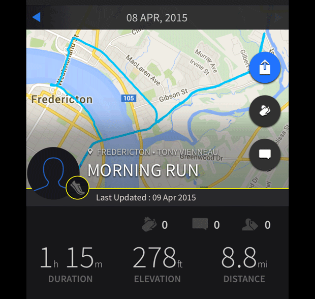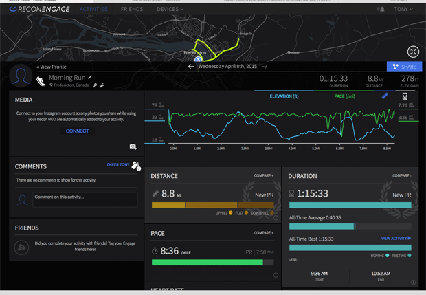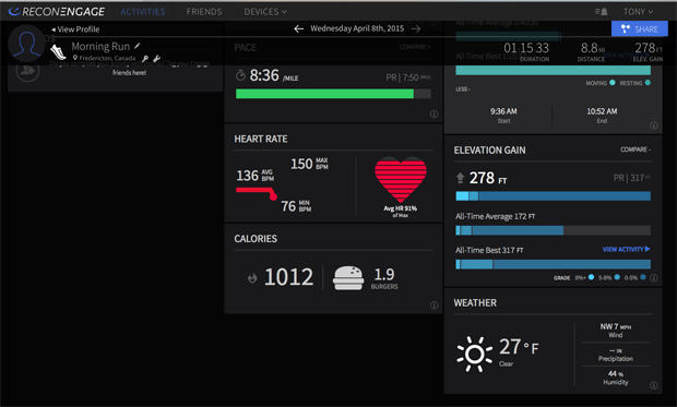At the end of your activity, the HUD will show summary statistics of your training activity. Currently, the post activity data displayed on the HUD is not correct but all the data pushed to Engage or the other sites is accurate. Recon is aware of this. Also, the elevation data displayed on the HUD originates from the Recon Jet but the web platform uses topographical data on the maps.
