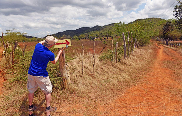 Jim Curl's good friend Larry Garment nails a course arrow into a post.