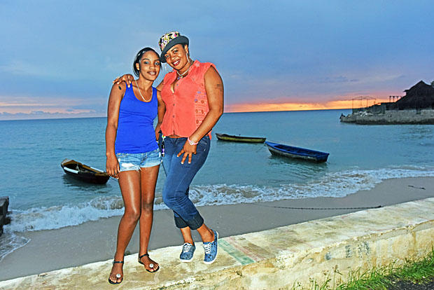 The two employees of a seaside convenience store outside the Peter Tosh memorial take a break.