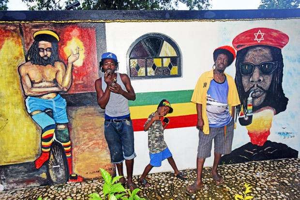 These two men are caretakers of the well kept memorial for reggae icon Peter Tosh.