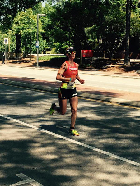 Brandon held on to the lead for the first 20 miles of the 56-mile bike segment on the outskirts of Raleigh, but Lawrence and Kessler had moved precariously close to the leader and were less than 30 seconds behind. Lauren Barnett was moving fast and she was next about 3:30 later and led a small group that contained McQuaid and Spieldenner Alexandra Tondeur and Caitlin Snow were riding almost 6 minutes back. Lawrence and Kessler pushed past race leader Brandon and pulled away. By the time the 2 athletes reached the bike-run transition they had managed to gain almost 2.5 minutes more over Brandon, with Barnett 30 seconds behind Brandon with the day’s best bike split of 2:18:53. McQuaid arrived about 20 seconds behind Barnett but Spieldenner arrived more than 4 minutes later.