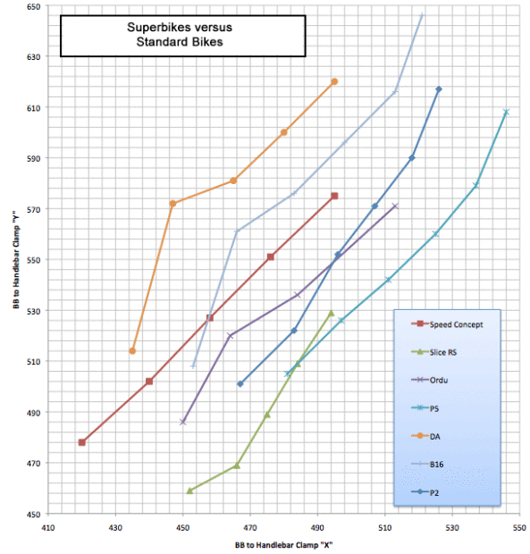 We’ve plotted the height and length of some tri bikes just below, and you can see how the Slice RS was just never became a large bike in height and length, when its custom stem was taken into consideration. The current Slice? This bike is geometrically sound, about like the old Slice (Chrissie’s Slice), very slightly tall versus its length. It’s got a small size built with 650c wheels (which I like). This slight tallishness is counteracted by a very low-profile Visiontech Trimax bar. Geometrically, yes, it’s sound.