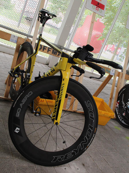 Sebastian Kienle's new custom painted Scott Plasma sits next to Maurice Clavel's Plasma and Andi Böcherer's Kuota. The cover on the aero extensions on Kienle's Plasma and the look of the derailleurs hints that this is not a standard SRAM group.