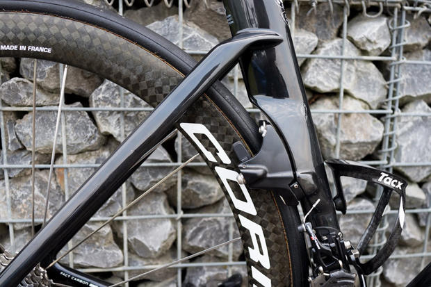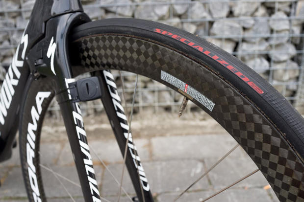 Fuglsang rides S-Works Turbo Allround 2 24mm tubular tires on Corima carbon wheels.