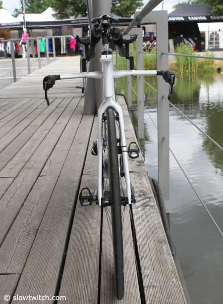 The front view shows the slippery profile and also how the extensions are at a different height to allow Frommhold to get his hands closer together.