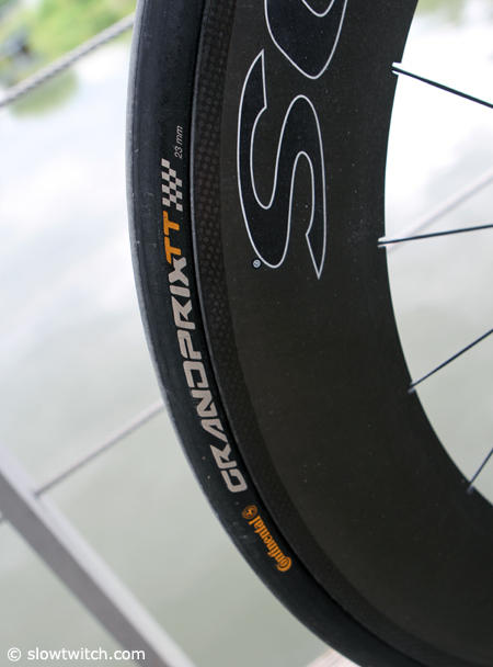A Reynolds Aero 72 wheel up front with a Continental GrandPrix TT 23 mm tire.