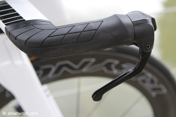 Frommhold rides Shimano Dura-Ace Di2 components but the most trick item up front are the Ergon grips on the extensions. Note also that the extensions feature different elevations.