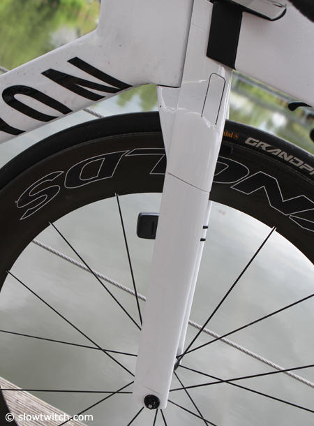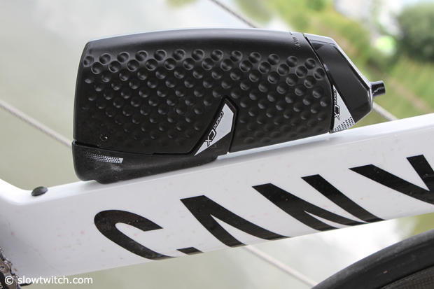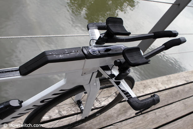 The integrated bento box and the aero liquid storage element up front still show signs of yesterday's hard ride.