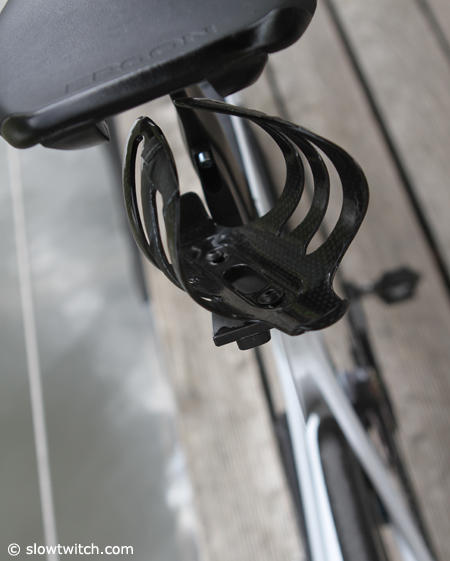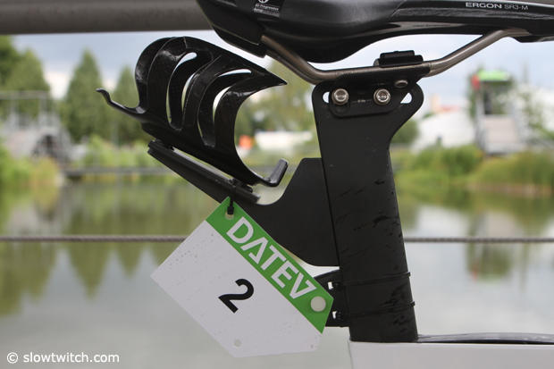 At first glance the cage looks like just another bottle storage, but this taped XLab cage is angled towards the drive side. Word has it that this helps him get to the bottle easier and with less drag.