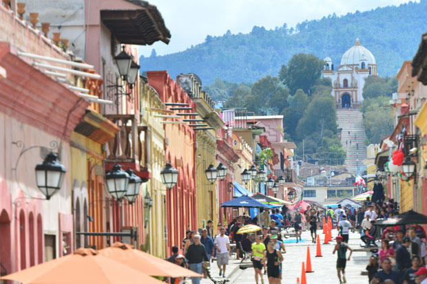 That would be the Triatlón de Mérida, which fills at 2,000 registrants but over 2 days, with kids and other races, totals more like 3,300. There are triathlons in in Chiapas (image just above, the run course in downtown San Cristobal de las Casas). In Acapulco. There is a moonlight triathlon in La Paz, near the tip of Baja, maybe 50 miles north of where Ironman Los Cabos takes place.