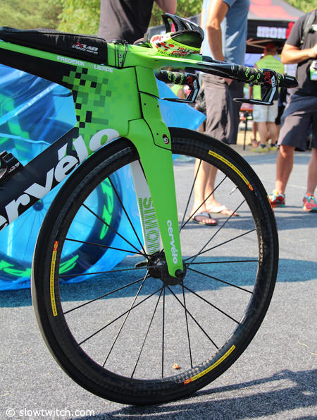 At the Ironman European Championships in Frankfurt, Germany we noticed the green custom painted Cervelo P5 of 2013 IM Kona champion Frederik Van Lierde. A bike loaded with Shimano Di2 components, Rotor cranks and power meter, Mavic wheels, CeramicSpeed upgrades and more.