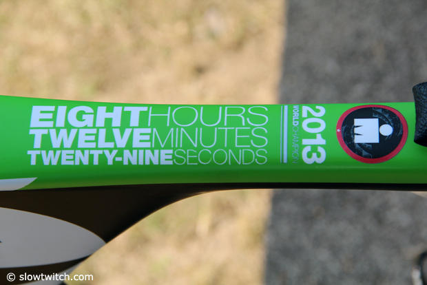 The winning 2013 Ironman World Championships time is noted on the top tube.