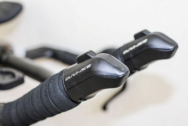 On his extensions Betten only shifts the rear derailleur with this 1-button Shimano Dura-Ace setup.